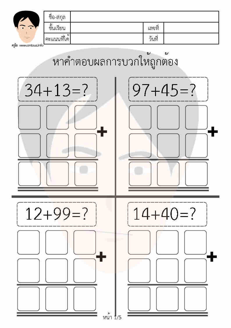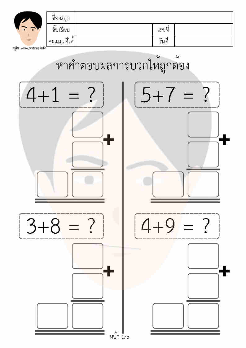 คณิตศาสตร์ ป.1 การหาตัวที่ไม่ทราบค่า ของการบวกและการลบ รวมทั้งการบวกและการลบใน 1 ใบงาน แบบฝึกหัด