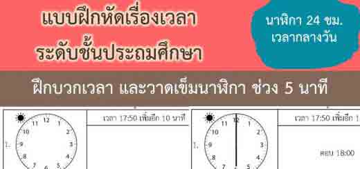 ontous.info แจกฟรี แบบฝึกหัดวิชาคณิตศาสตร์ เรื่อง เวลา การบอกเวลาช่วง 1 นาที รูปแบบนาฬิกา 24 ชั่วโมง ช่วงกลางวัน ด้วยการกำหนดภาพนาฬิกาให้แล้วบอกเวลาให้ถูกต้อง จำนวนกว่า 90 ข้อ พร้อมเฉลยท้ายแบบฝึก ฟรี ดาวน์โหลด PDF