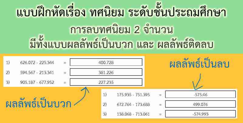 ontous.info แจกฟรี แบบฝึกหัดวิชา คณิตศาสตร์ เรื่อง ทศนิยม การลบทศนิยม 2 จำนวน แบบฝึกแบ่งออกเป็น 3 แบบ รวมกว่า 1500 ข้อ ประกอบด้วยแบบฝึกที่ง่ายจำนวนตัวเลขน้อยหลัก และแบบยากจะเป็นตัวเลขหลายหลัก และแบบสุดท้ายคือผลการลบที่มีค่าติดลบ (มีผลการลบน้อยกว่าศูนย์: 0) พร้อมเฉลยท้ายแบบฝึกทุกข้อ โหลดเอาไปใช้งานได้ฟรี download free