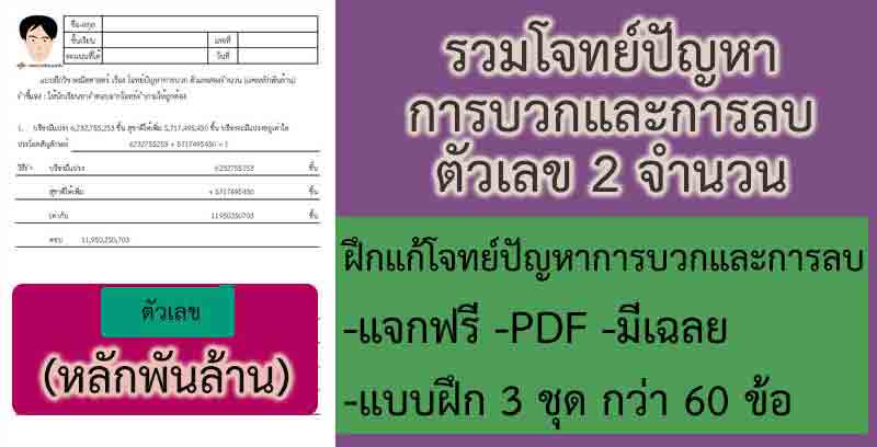 แจกฟรี แบบฝึกหัดคณิตศาสตร์ เรื่อง โจทย์ปัญหาการลบ ตัวเลขสองจำนวน มีค่าอยู่ในหลักร้อย รูปแบบไฟล์ PDF จำนวน 3 ชุด กว่า 60 ข้อ พร้อมเฉลยท้ายแบบฝึก ทุกชุด