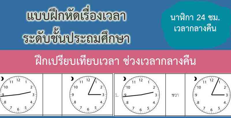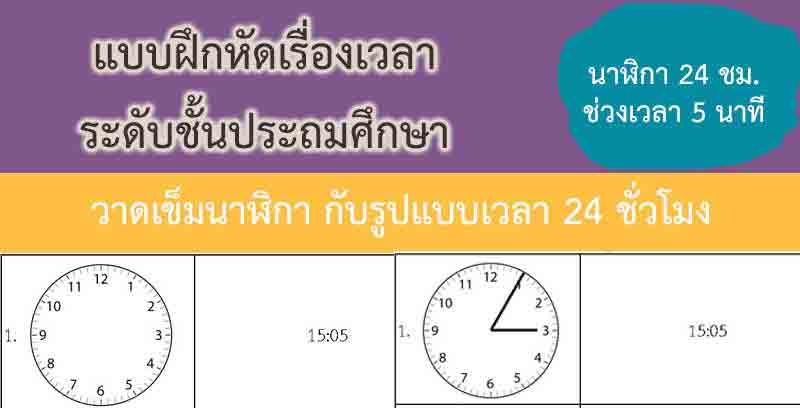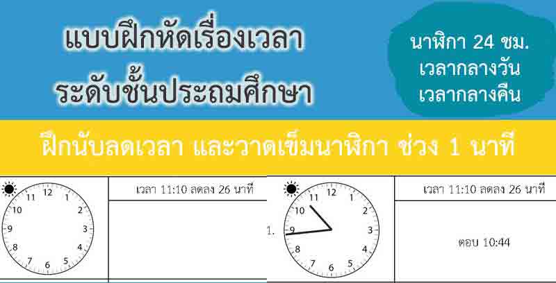 ontous.info แจกฟรี แบบฝึกหัดวิชาคณิตศาสตร์ เรื่อง เวลา การวาดเข็มนาฬิกา ช่วงเวลา 1 นาที รูปแบบเวลา 24 ชั่วโมง ภาพนาฬิกาใหญ่ชัดเจน จำนวนแบบฝึกกว่า 90 ข้อ พร้อมเฉลยท้ายแบบฝึก รูปแบบไฟล์ PDF ดาวน์โหลดฟรี download free
