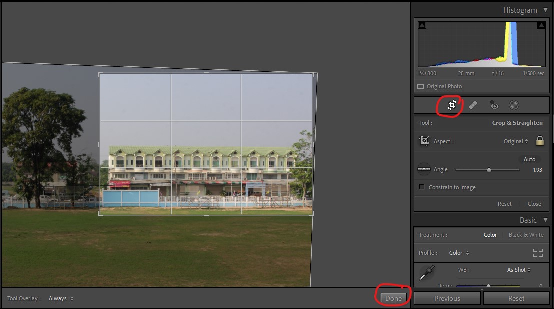 การซ่อนและแสดงปุ่ม Done ในมุมมอง Develop เพื่อจะตัดครอบ ภาพ (Crop Overlay) หายไป เรียกกลับมาด้วยแป้นคีย์ลัด ดัว T สลับไปมาเพื่อซ่อนและแสดง